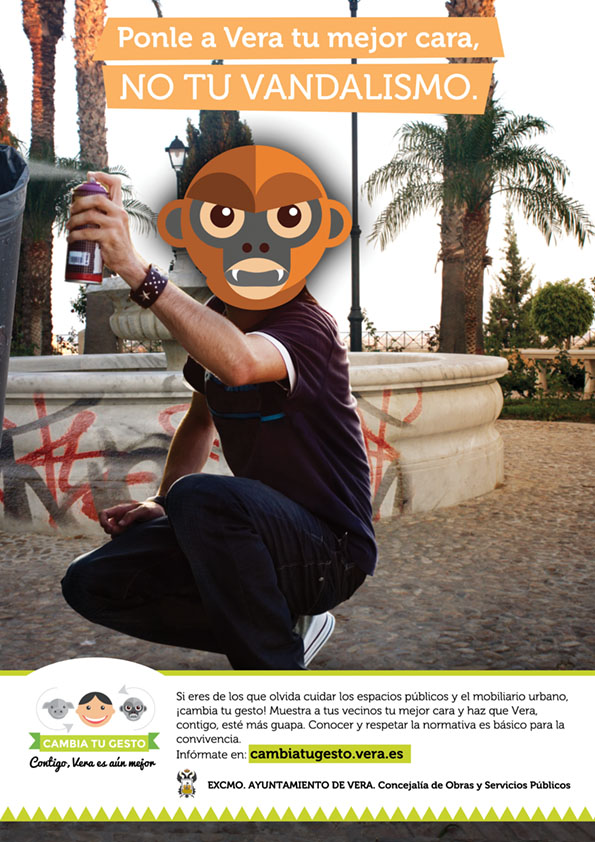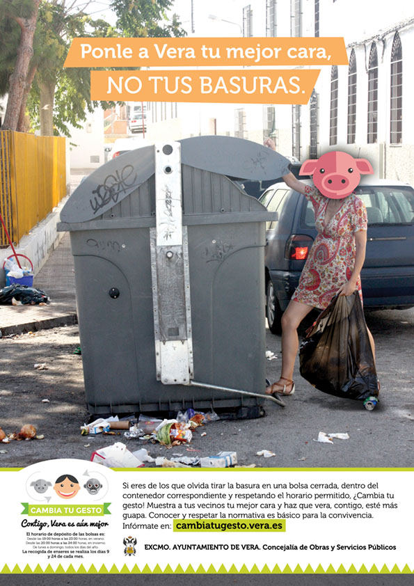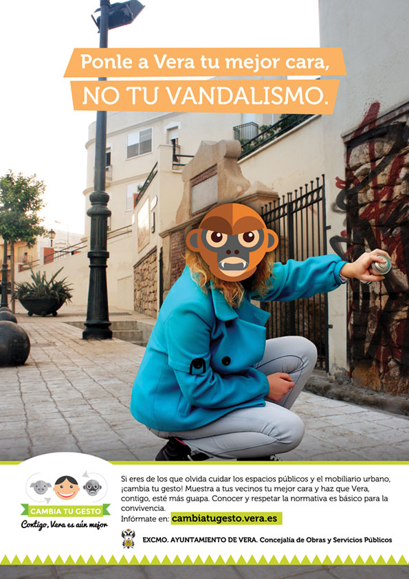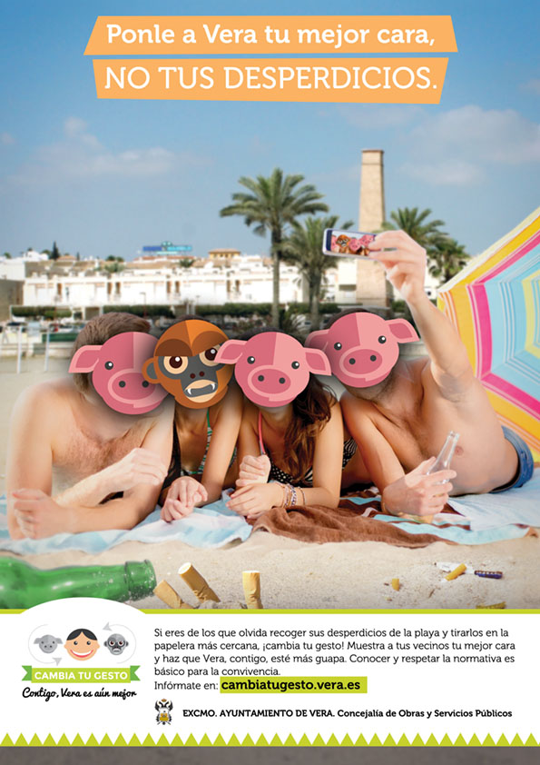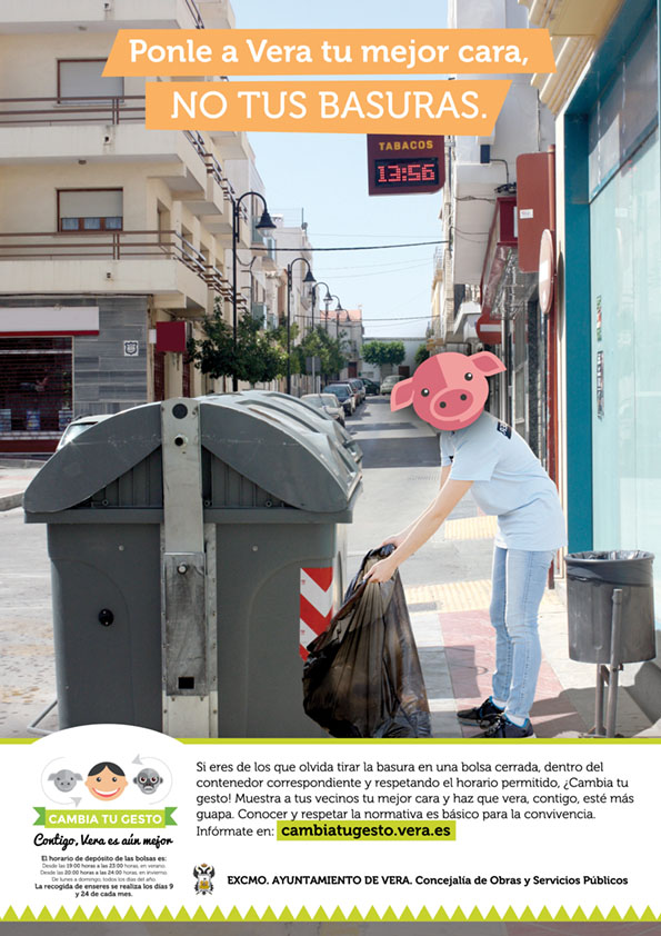 «Cambia tu gesto» es una campaña publicitaria de concienciación ciudadana, creada por el Ayuntamiento de Vera, que pretende animar a los vecinos a ejercer su responsabilidad de mantener la limpieza y el buen estado de los espacios públicos de la ciudad, así como informar sobre de la normativa vigente y las sanciones.